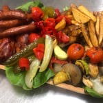 Ciolan copt 700 g , piept de pui 250g , ceafă de porc 250g, mici 4 buc 320g, cartofi wedges 800g, legume La grătar 300 g și murături 300g